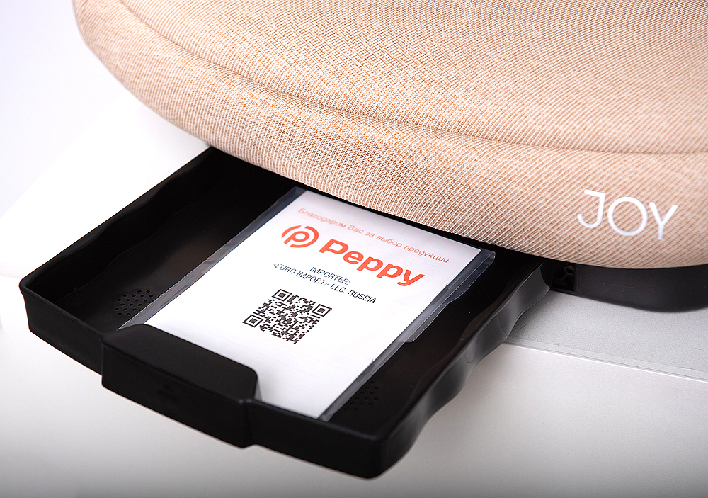 Peppy JOY оборудовано системой Isofix, которую при необходимости можно спрятать под сидением (для перевозки в автомобиле не оборудованным isofix). Крепление регулируется по длине и по углу наклона. Благодаря этому автокресло плотнее прижимается к сидению и спинке автомобиля, что уменьшает люфт и увеличивает безопасность. В передней части под сидением расположен пластиковый отсек для хранения мелочей.