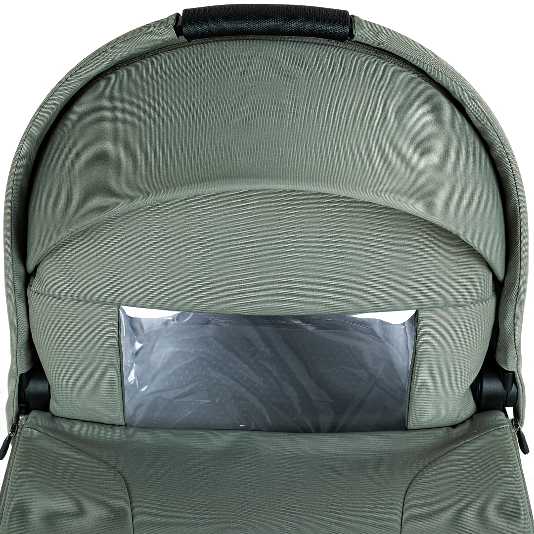 Капор люльки оборудован ручкой для переноски, имеется съемный козырек, дополнительная секция, климатическое окно под молнией в корпусе люльки и в капюшоне.