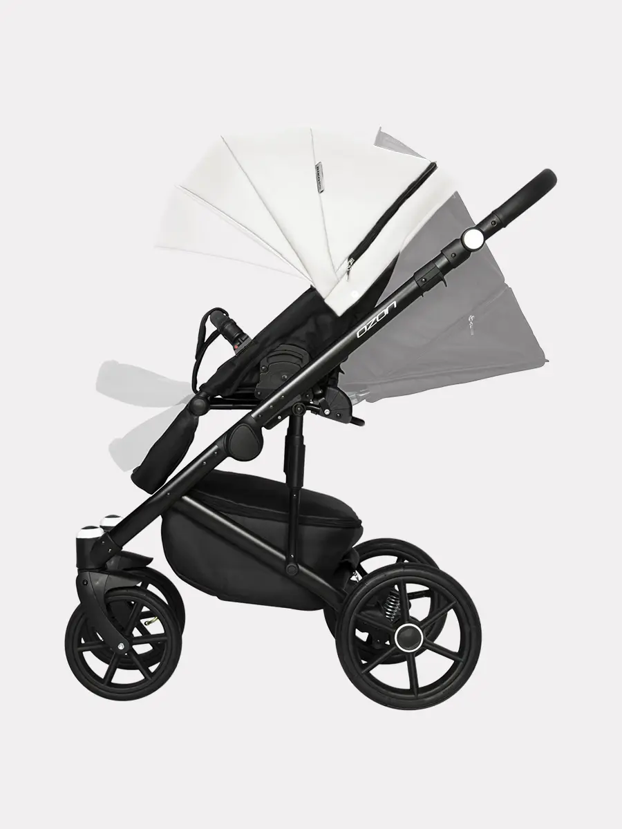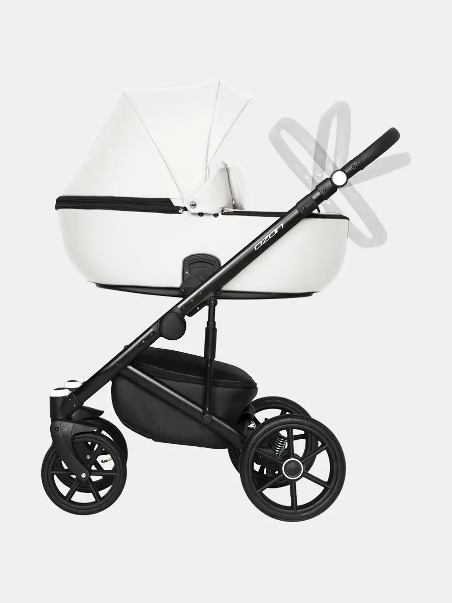 Коляска Ozon оборудована надувными колесами, передние в диаметре 24 см, а задние 30 см.