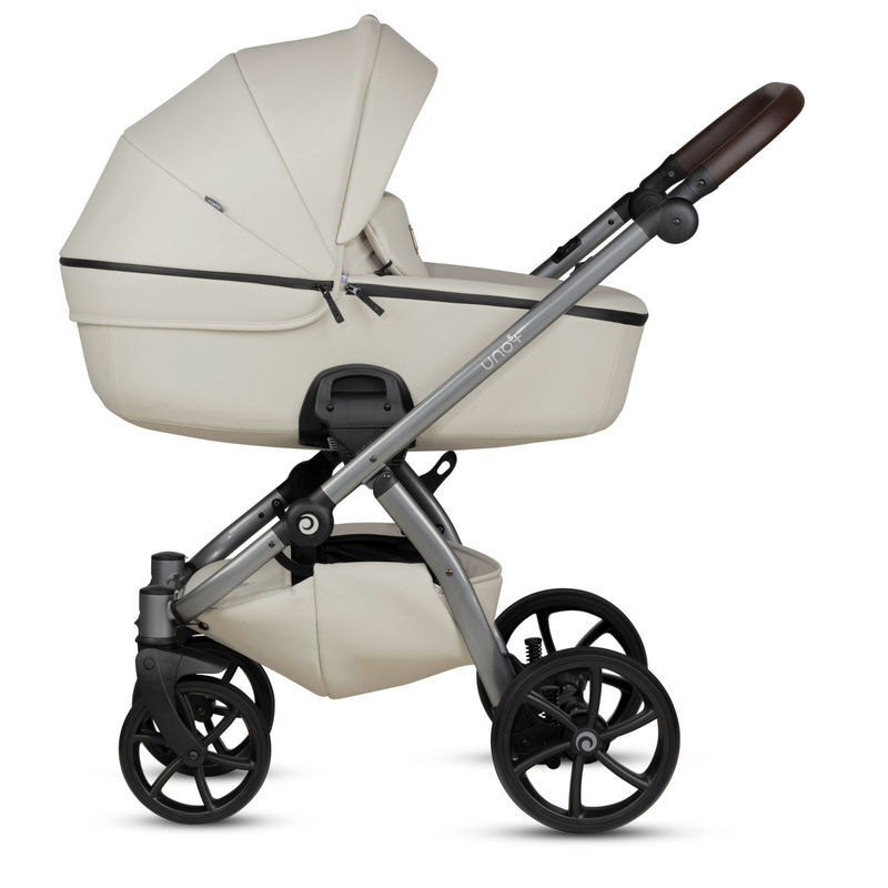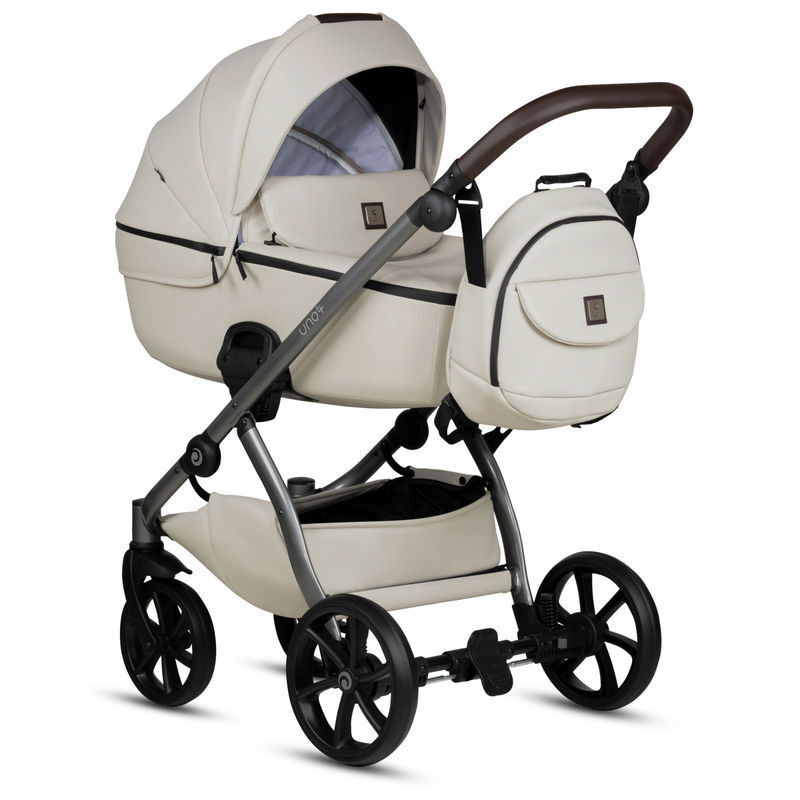 Шасси у Tutis Uno 5 Plus Essentian Collection 2 в 1 изготовлено из лёгкого, но крепкого алюминия. Коляской легко управлять одной рукой. Родительская ручка регулируется по высоте. Также на неё крепятся подстаканник и модный рюкзак для мелочей. Колёса гелиевые, изготовлены по технологии Tutis All-Road TM Technology, не боятся проколов, требуют минимум ухода. Передние «плавающие», имеют фиксацию в положении «прямо». Полноценная амортизация колёс с регулировкой обеспечивает мягкий ход на любых дорогах.