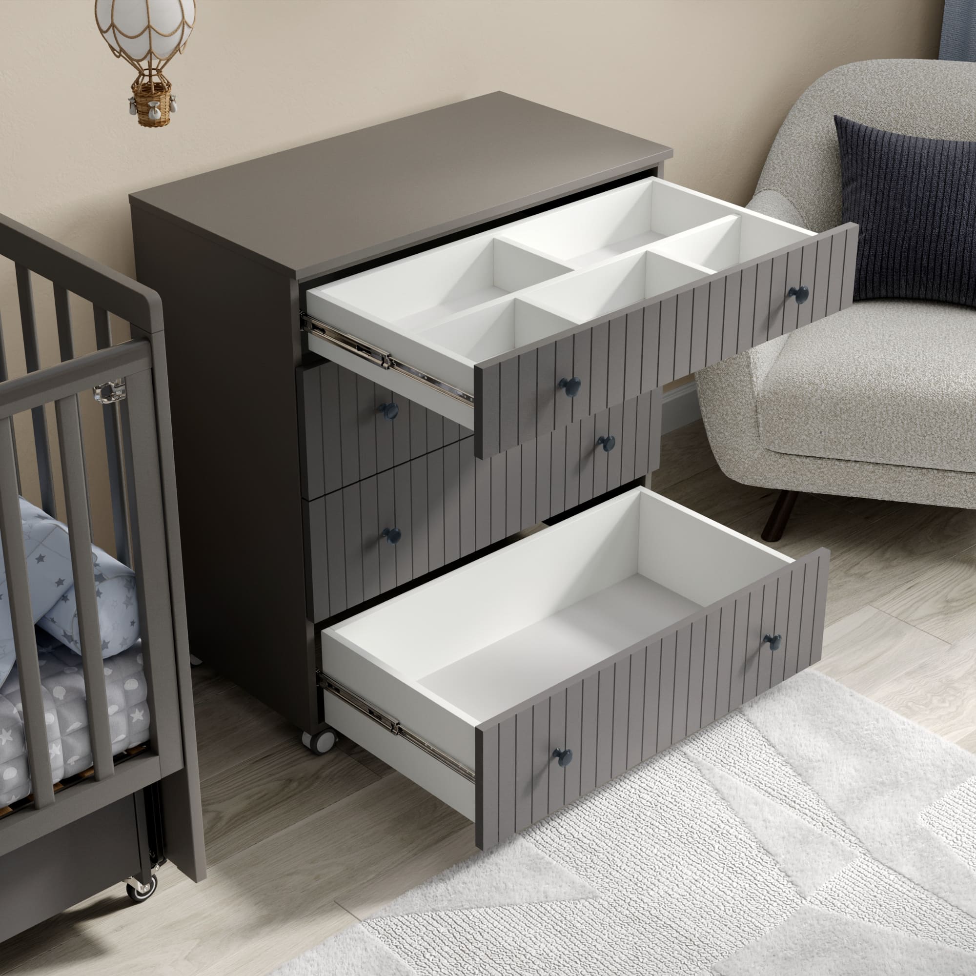 • Фасады имеют вертикальную фрезеровку, которая придает комоду дополнительного шарма.