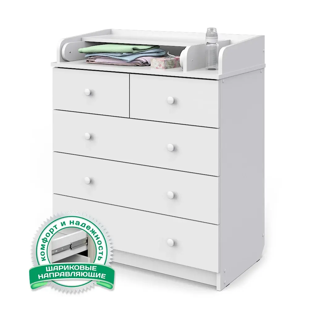 Удобный пеленальный комод с отделением для средств по уходу за малышом. Все необходимое будет всегда под рукой. Ящики комода оснащены шариковыми направляющими полного выдвижения, которые обладают плавностью хода и бесшумностью, а также увеличенным ресурсом пользования.