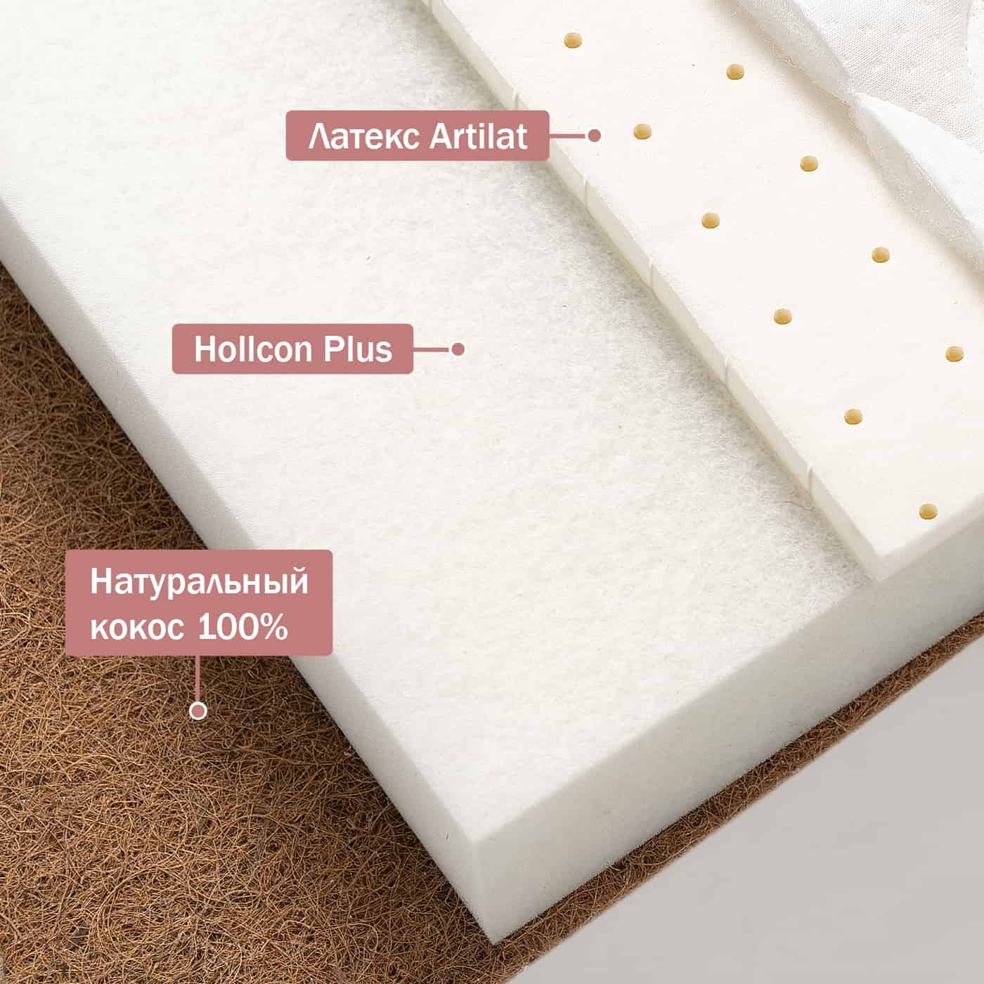 В основе матраса высокопрочный материал Hollcon Plus 95 мм, который обладает антибактериальными свойствами, не имеет запаха и не теряет форму с течением эксплуатации.