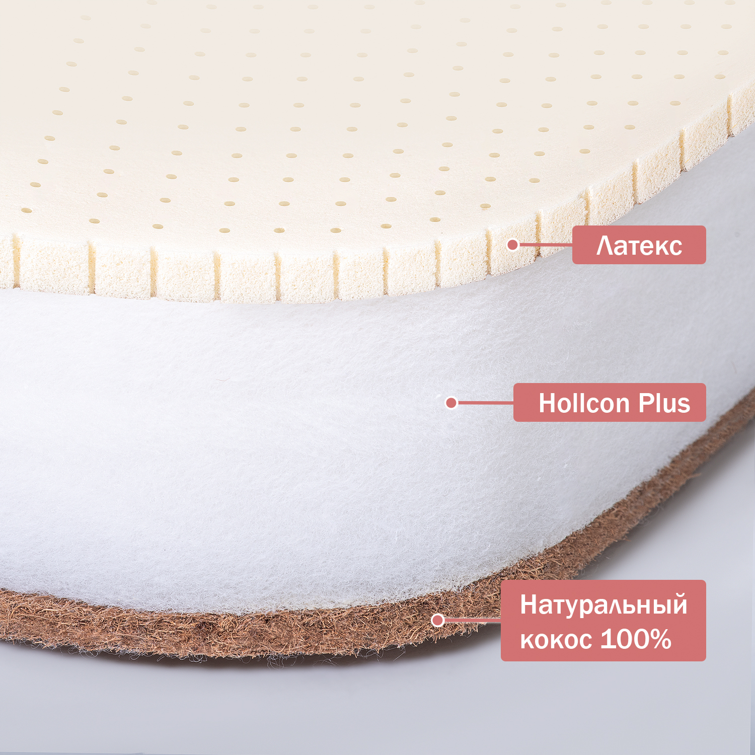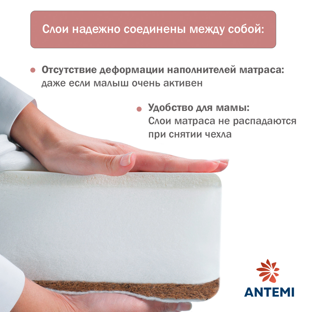 С одной стороны слой натуральной латексированной койры 10 мм, он обеспечивает максимальный ортопедический эффект и придает максимальную жесткость, которая необходима новорожденному.