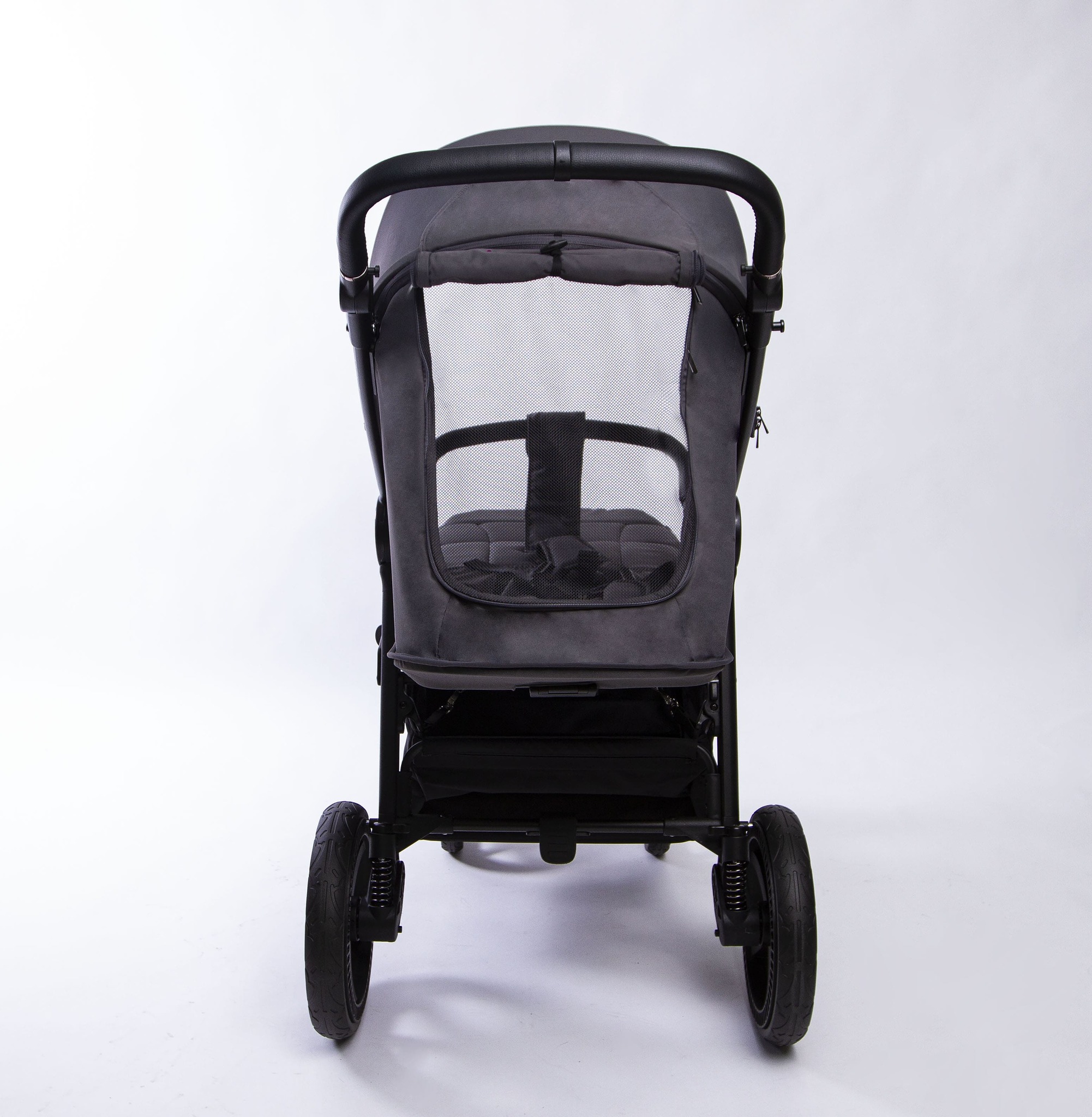 Удобству передвижения способствует пружинная регулируемая амортизация и большие резиновые колеса – коляска спокойно преодолевает неровную дорогу и неглубокий снег!